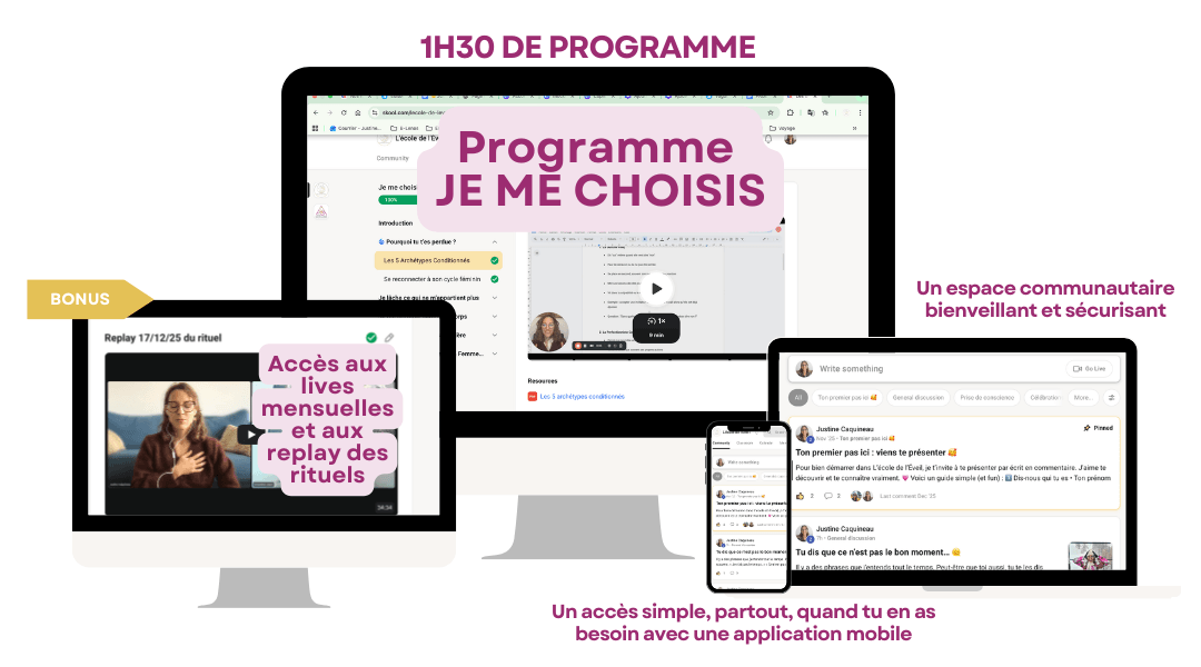 Accès immédiat à un programme complet pour te reconnecter à toi-même, libérer tes blocages et poser tes premiers choix.